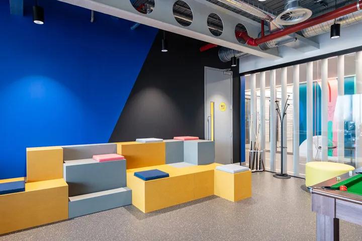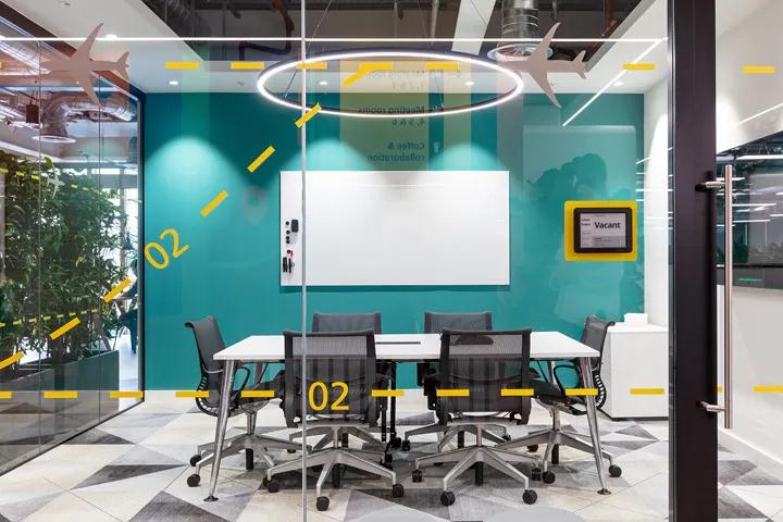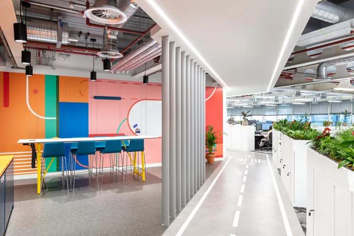 為了創(chuàng)造一個(gè)可以反映公司前瞻性思維的文化空間,此表殼將其與旅游主題元素相結(jié)合,創(chuàng)造了一個(gè)充滿獨(dú)特氣質(zhì)的時(shí)尚創(chuàng)新空間。孟菲斯經(jīng)典的娛樂元素和智能瓷磚,幾何壁紙,醒目的印花織物以及豪華的水磨石地板使房間變得時(shí)尚。尤其是在休閑區(qū),高檔家具襯托了孟菲斯風(fēng)格的裝飾主題,宜人的多彩配色帶來了美妙的時(shí)尚視野。更加注意溝通和團(tuán)隊(duì)合作的文化。因此,設(shè)計(jì)團(tuán)隊(duì)構(gòu)建了一個(gè)由多個(gè)會(huì)議室,共享辦公桌組成的開放式布局,并在團(tuán)隊(duì)的基礎(chǔ)上創(chuàng)造了平等的工作環(huán)境,而會(huì)議室為私人交流和創(chuàng)新合作提供了豐富的空間。此外,設(shè)計(jì)團(tuán)隊(duì)還介紹了一種特殊的會(huì)議區(qū)域模型,以鼓勵(lì)工作中的協(xié)作。